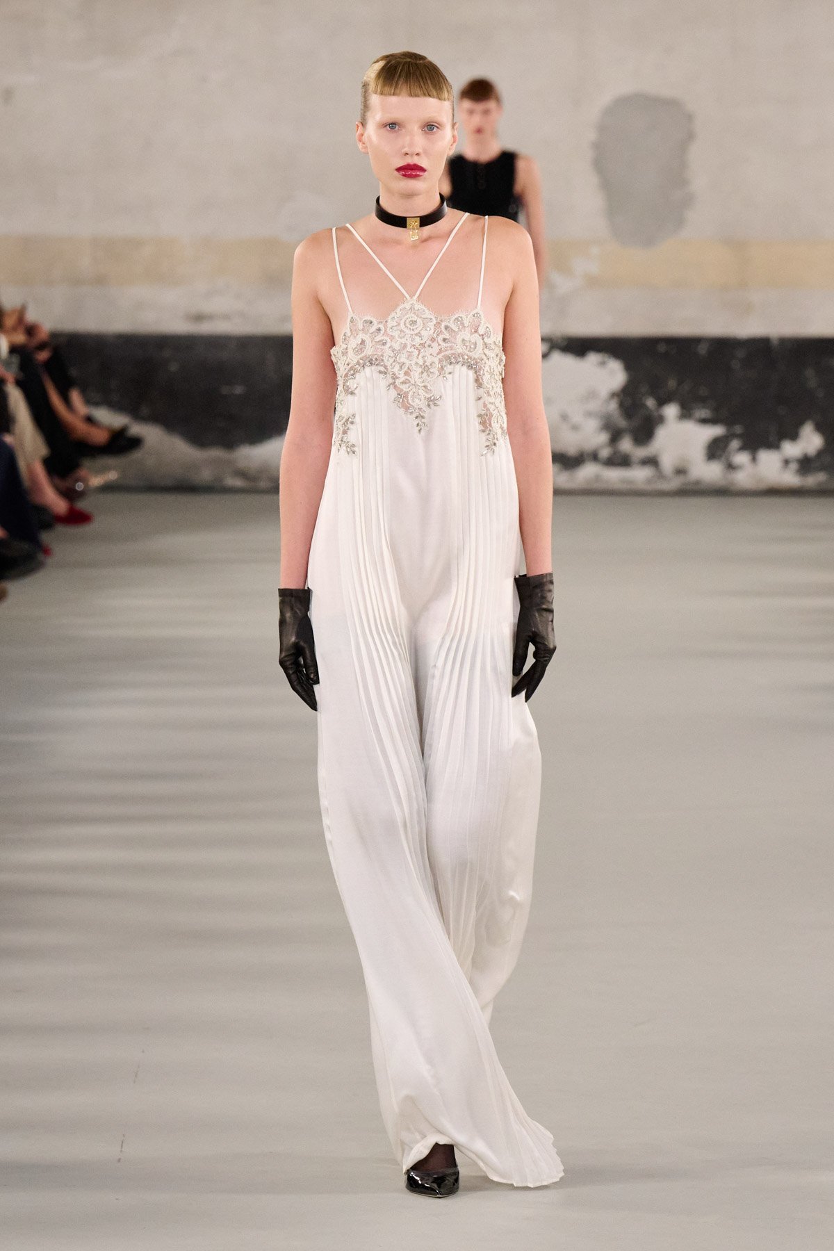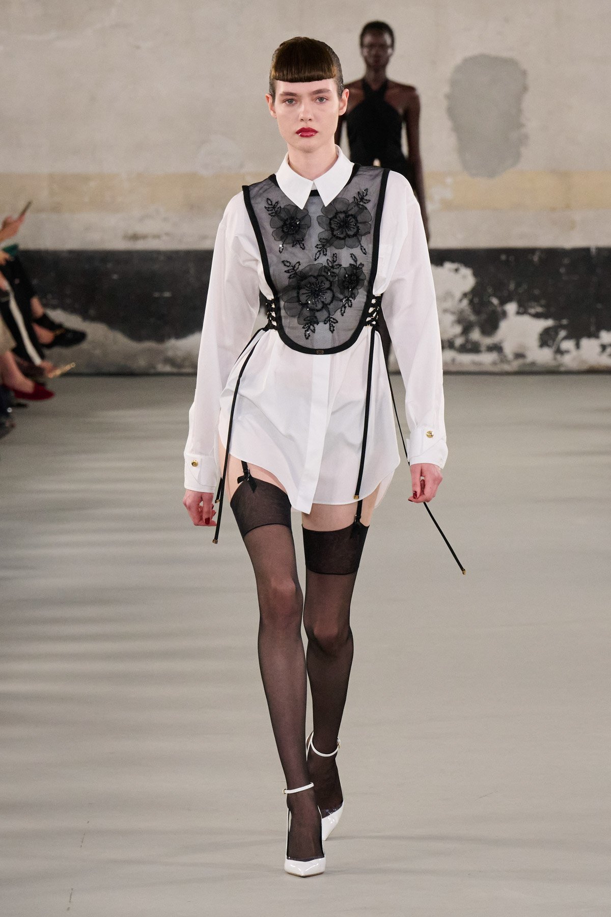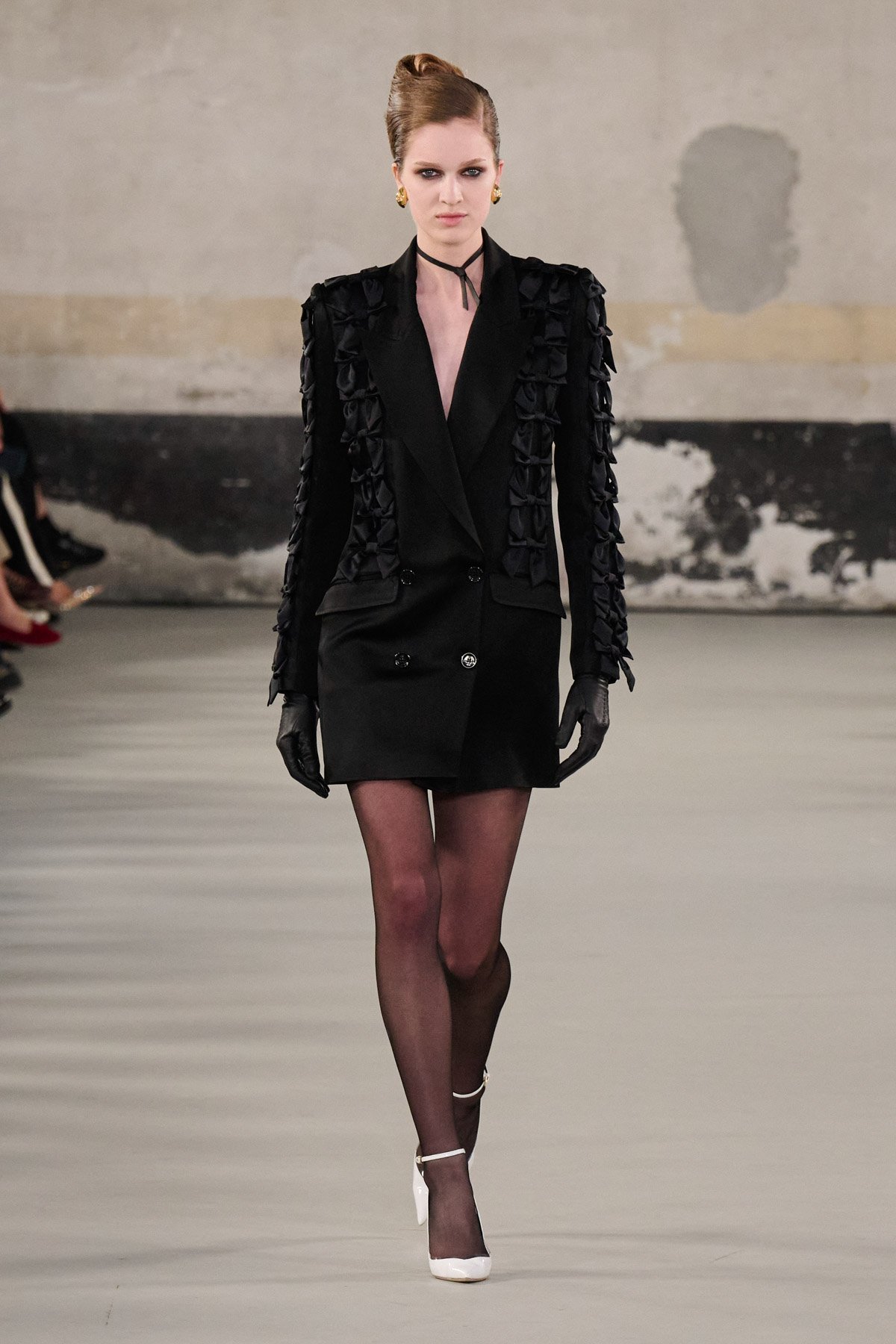 Le giacche strutturate e i pantaloni maschili convivono armoniosamente con tessuti romantici come il pizzo, e dettagli come fiocchi e fiori. La giacca è la protagonista assoluta, rappresentando la perfetta sintesi della collezione. Abbinata a pantaloni dal taglio maschile o indossata sopra abiti iper-femminili, definiti da dettagli provenienti dalla corsetteria e dalla lingerie, incarna il dualismo della collezione. I tessuti maschili sono accostati a materiali delicati come tulle e organza di seta.
