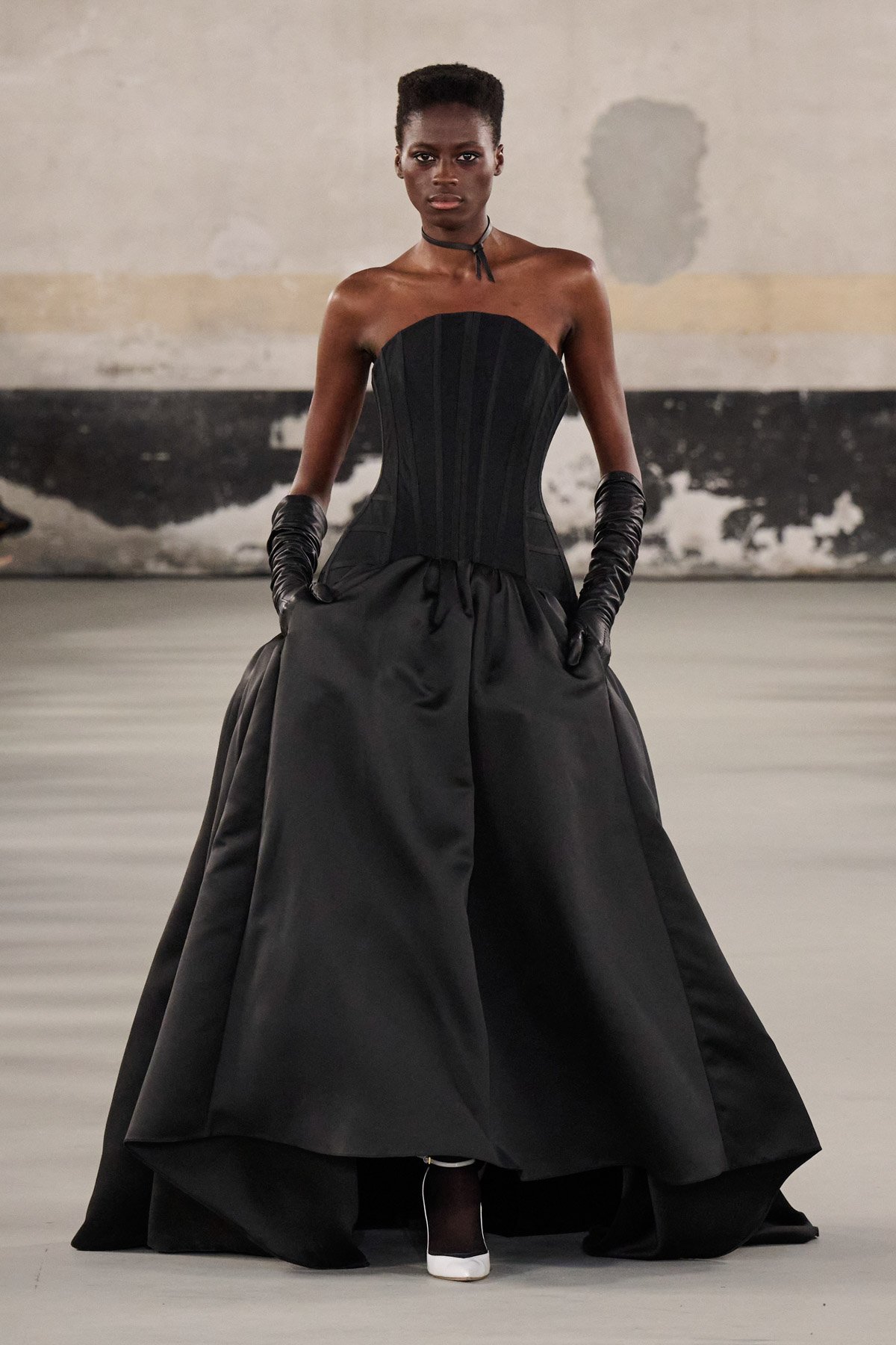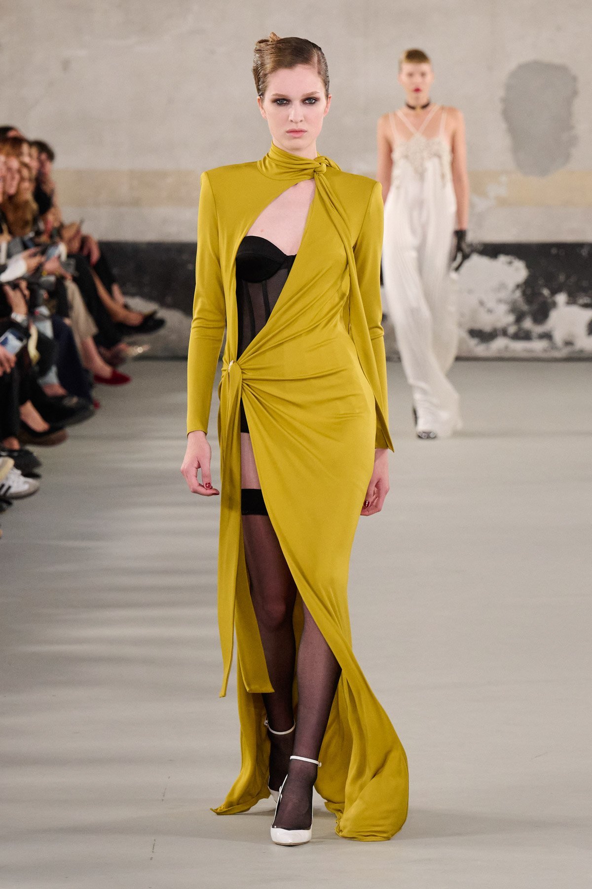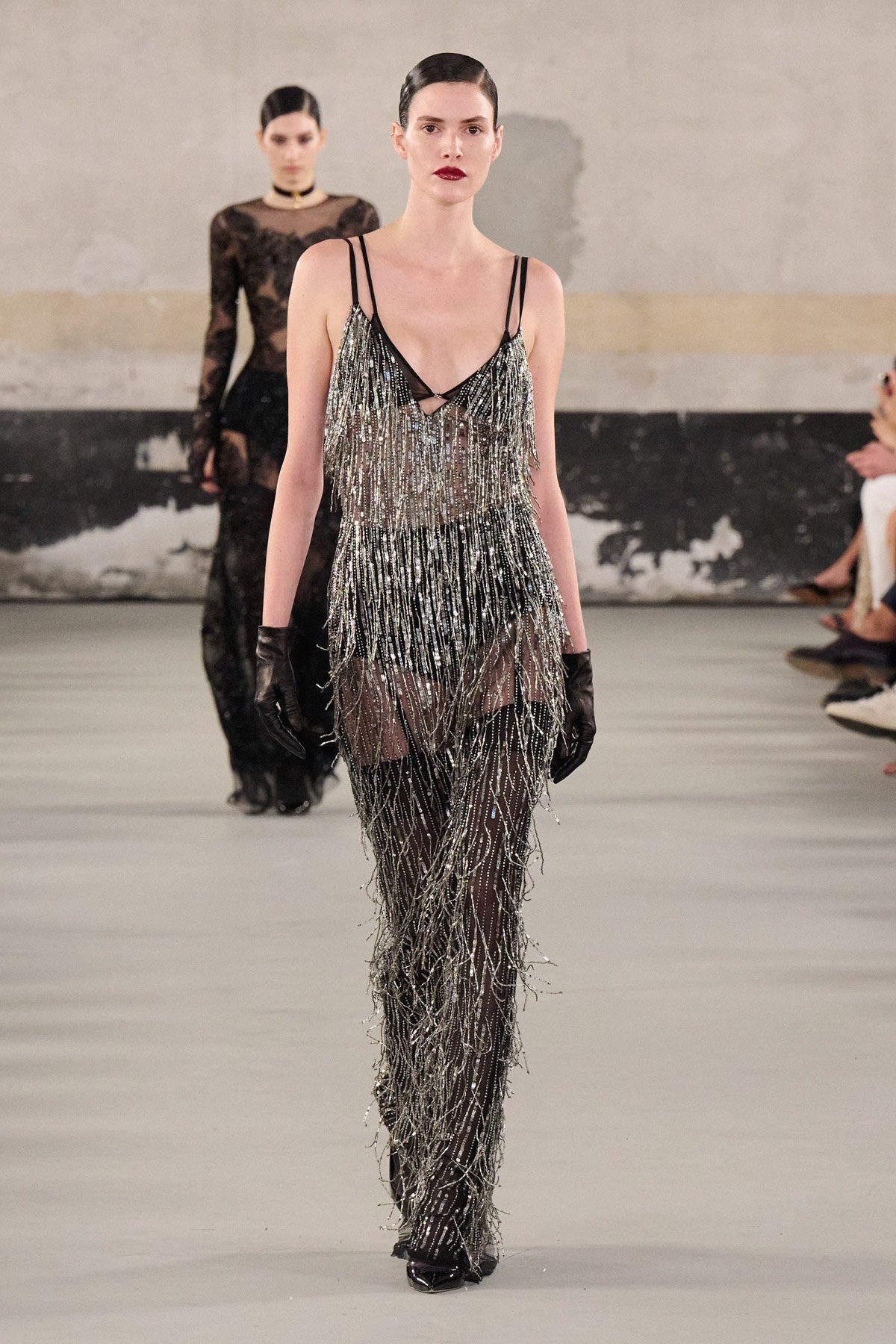 La trasparenza del tulle esalta il corpo femminile, il bianco e il nero dominano, ma la vera sorpresa sono il cacao, che si avvicina al nero con la sua profondita, e il color curry, una tonalità più vivace, che spezza la cartella colori, rappresentando i contrasti della donna in passerella.