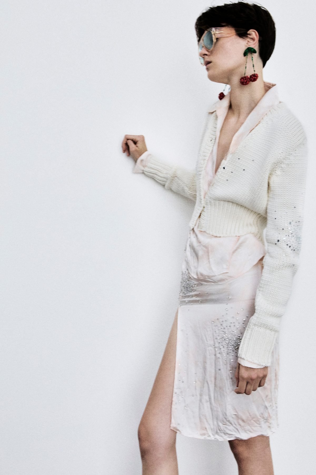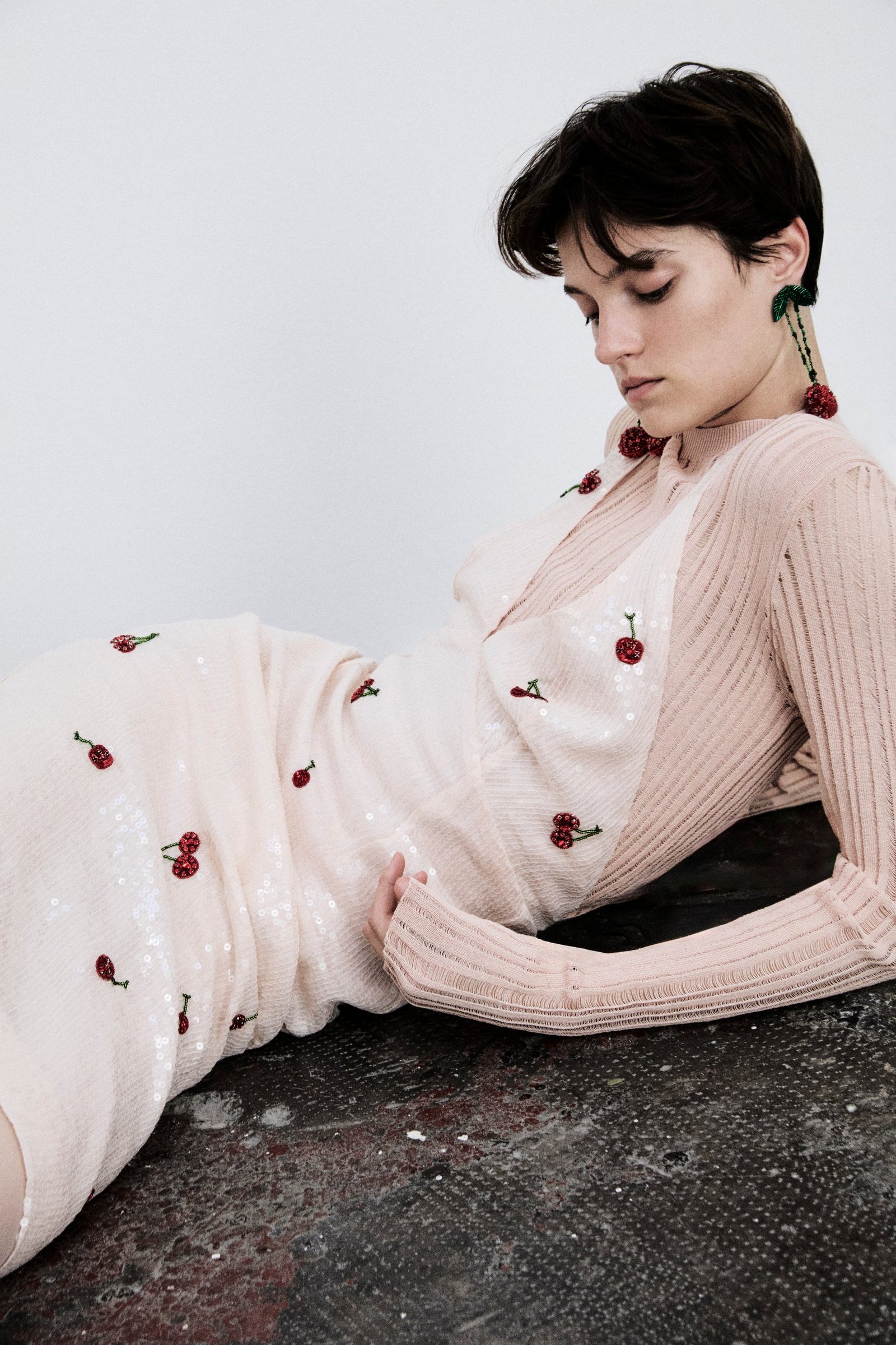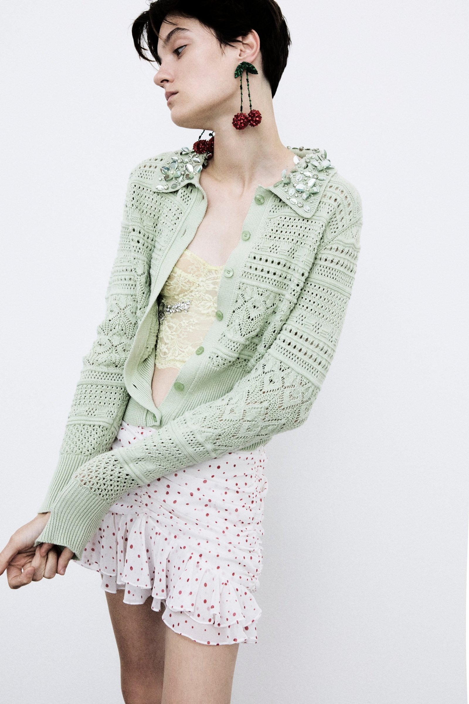 The real novelty of the season, however, is the print: cherries and polka dots mark the brand’s first graphic approach, becoming an obsession and the common thread of the collection itself. Cherries, a fruit dear to the designer for family memories, in mini or maxi version, appear on different garments, in mini version embroidered on chocolate-colored grisaille suits with a sleek line, or maxi embroidered on nude color evening dresses, entirely covered with transparent sequins. Polka dots, which start small and