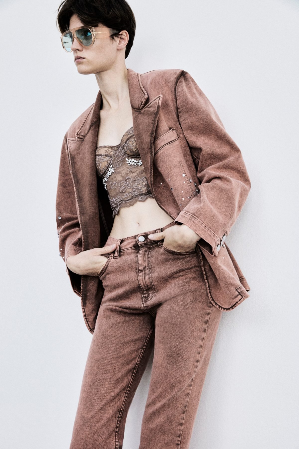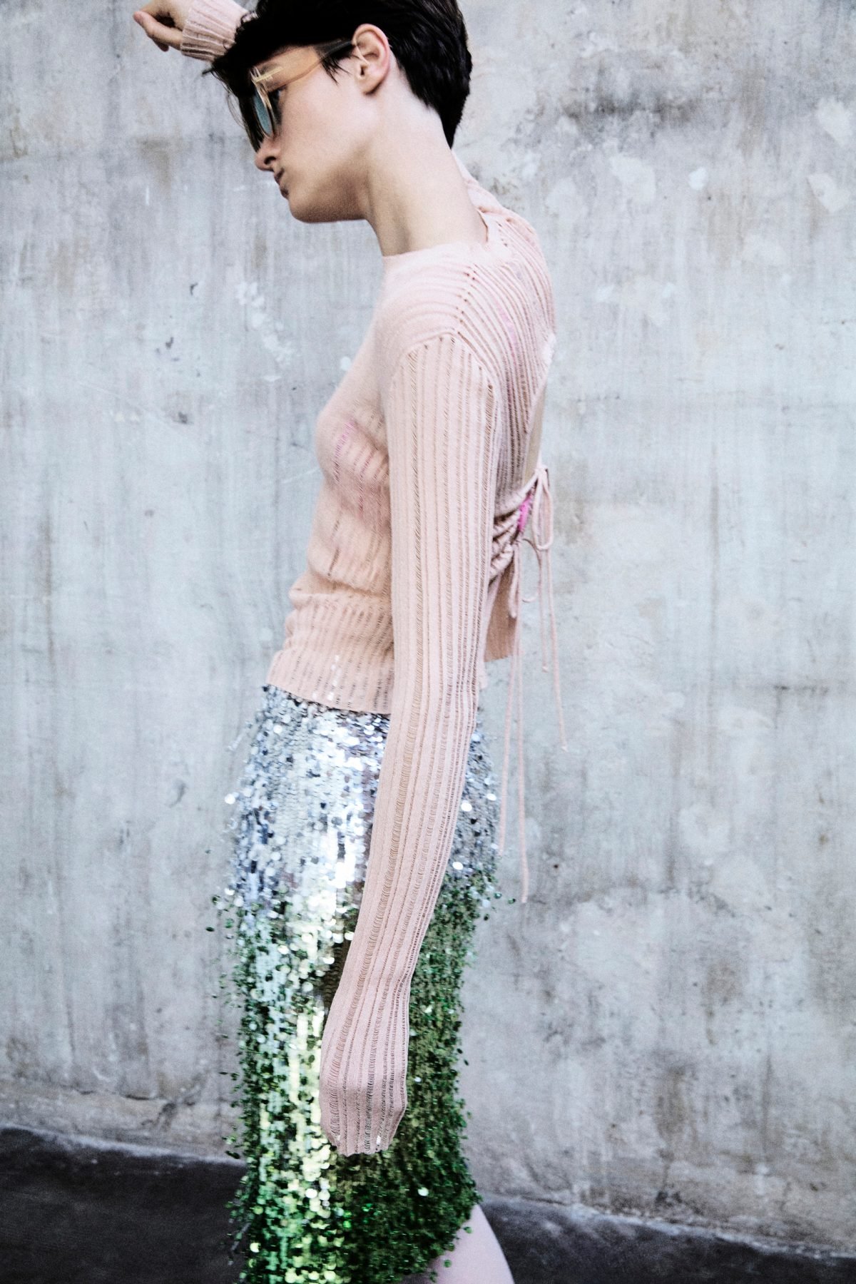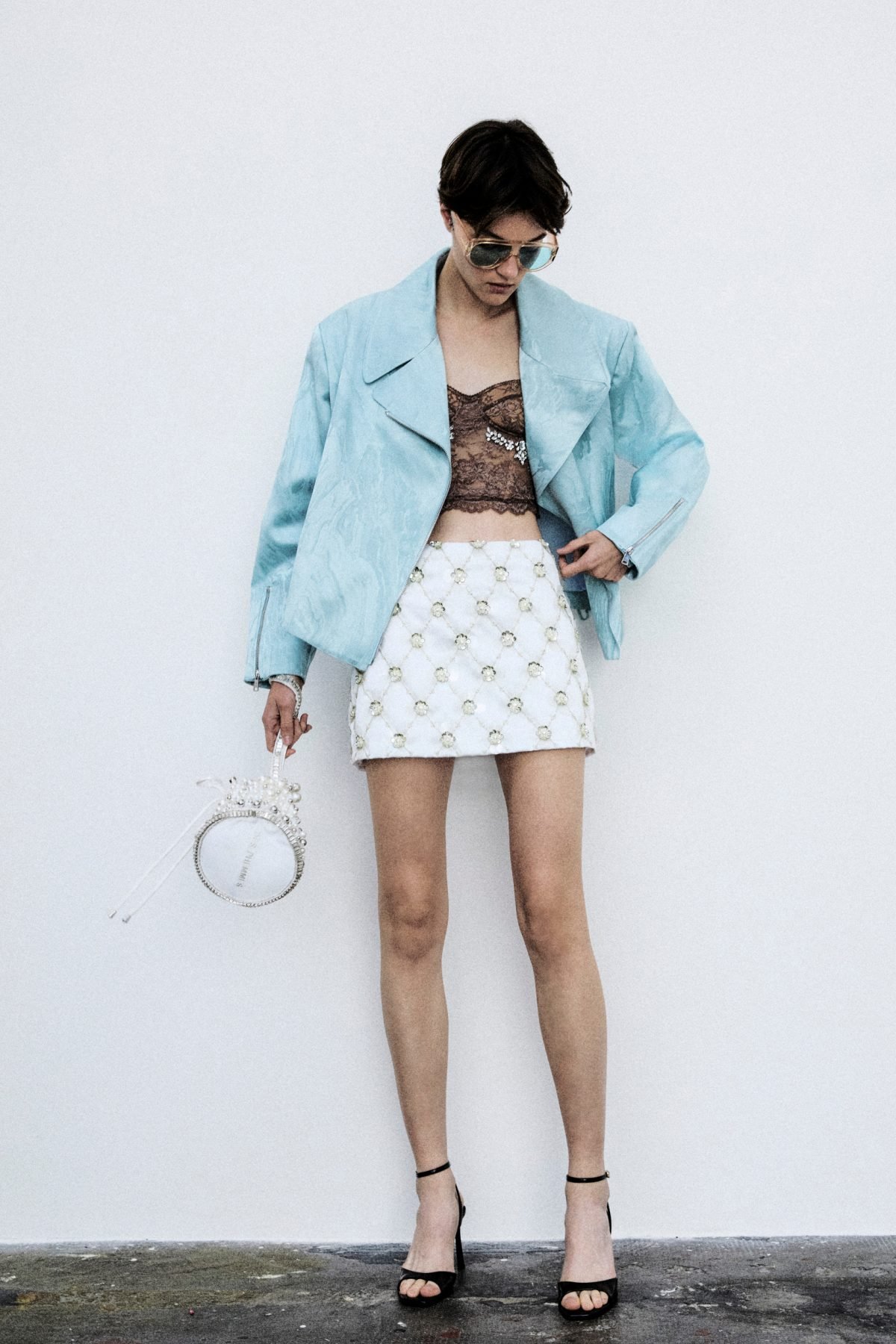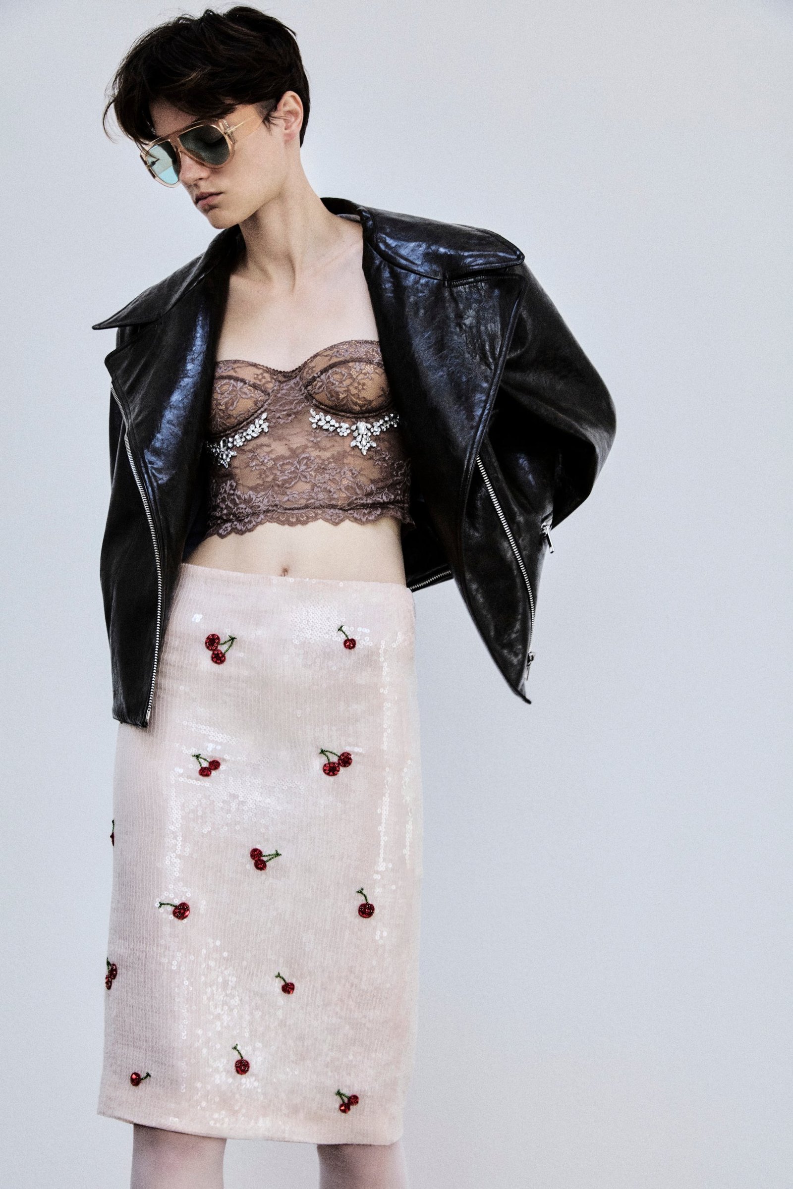 un mix di opposti: chiodi in ecopelle invecchiata si mixano a bustini ricamati in pizzo chantilly color cioccolato e a longuette nude “bagnate” da paillettes trasparenti