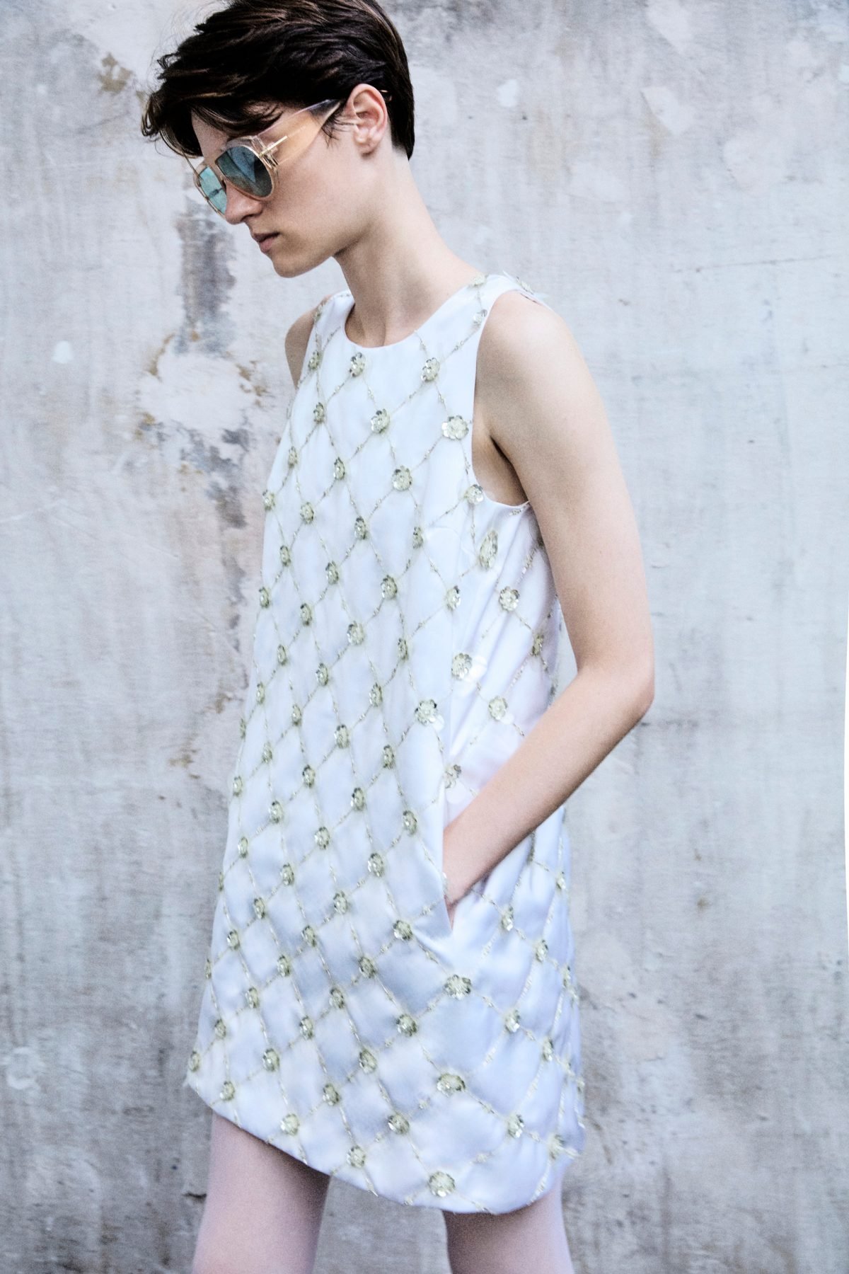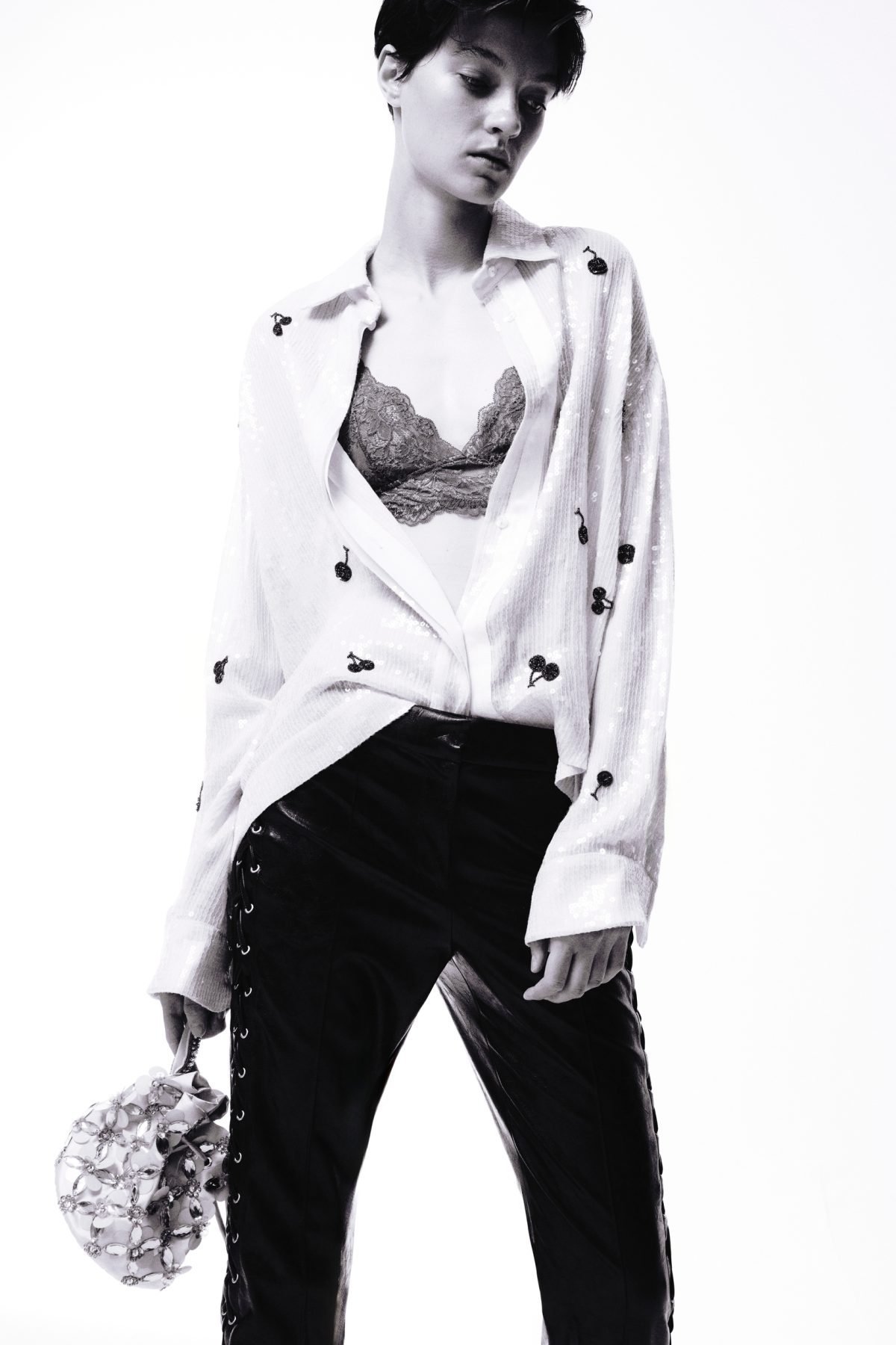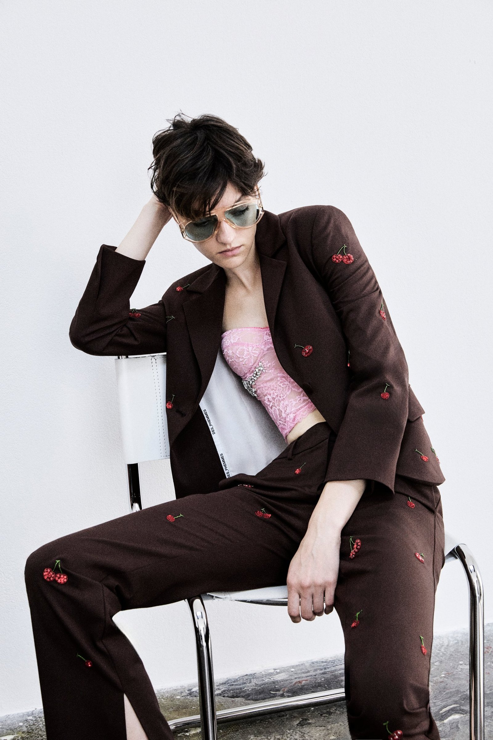 The wardrobe becomes a mix of opposites: aged eco-leather biker jackets are mixed with embroidered lace bustiers in chocolate color and nude longuette skirts covered in transparent sequins and embroidered cherries. Dresses with hyper-clean lines and 60s matrix are covered with geometric embroideries, in soft or super saturated tones. The men’s shirt, an essential item in the Des_Phemmes wardrobe and a “cult” garment in the male wardrobe, is worn with hand-embroidered degradé sequin longuette skirts or A-line miniskirts in duchess silk with geometric embroidery. Lace embroidered lingerie in lemon, fuchsia, and chocolate once again deviates from its original function of a