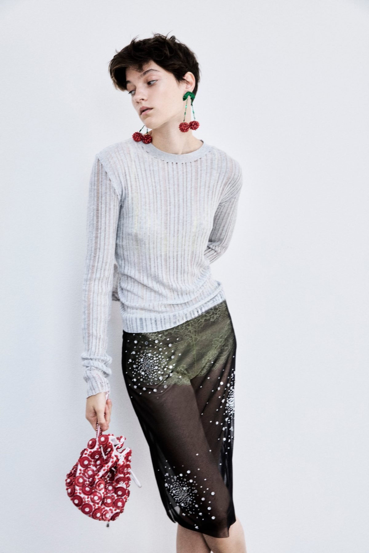 ciliegie, frutto caro al designer per memoria famigliare, in versione mini o maxi, fanno capolino su capi diversi, in versione mini ricamate su tailleur in grisaglia color cioccolato dalla linea asciutta, o maxi applicate su abiti da sera nude, interamente ricoperti di paillettes trasparenti. I pois, che nascono piccoli e stampati su georgette di seta, diventano maxi e 3d su leggeri e impalpabili abiti e gonne in organza. I due disegni si mescolano così su abiti, gonne e top in georgette di seta su cui, da un fondo nero a pois bianchi, si accendono ciliegie rosse.