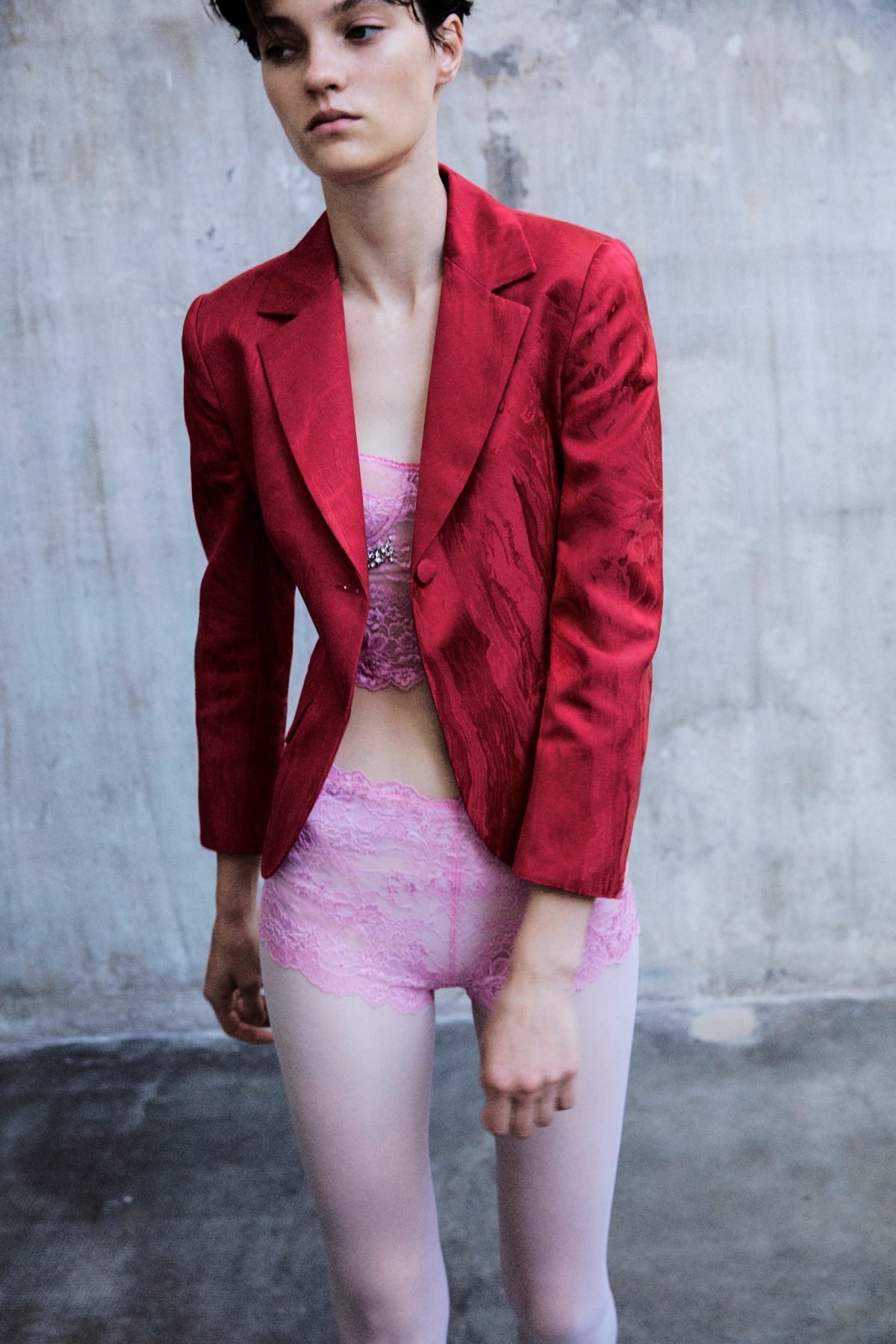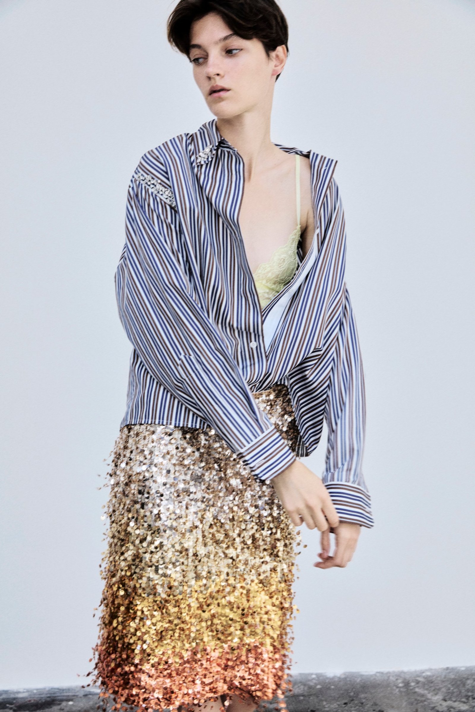 hidden garment, becoming a true accessory to the look, enhancing its colors and silhouettes. Oversized shirts and nude-colored tulle miniskirts, adorned with macro roses made of ribbons and crystals, reveal bright and vibrant-toned bralettes and culottes. Transparency and layering become the leitmotif of the collection: garments in lightweight and transparent fabrics like georgette and silk organza are worn with visible lingerie in vivid colors, emphasizing the presence of the underwear without ever wanting to hide it.