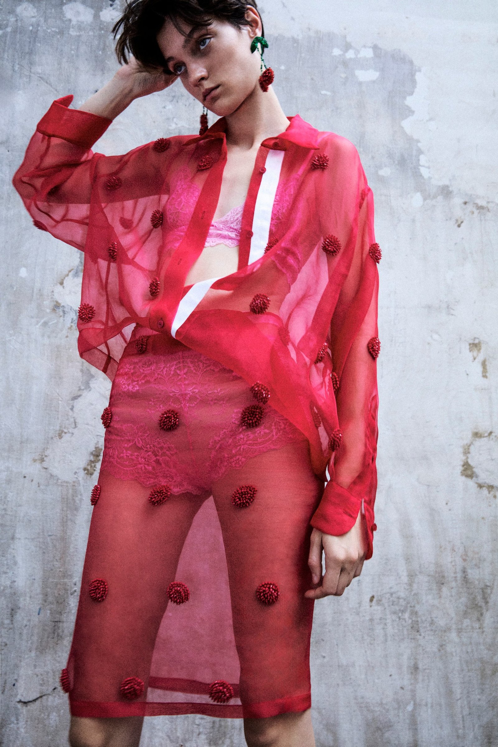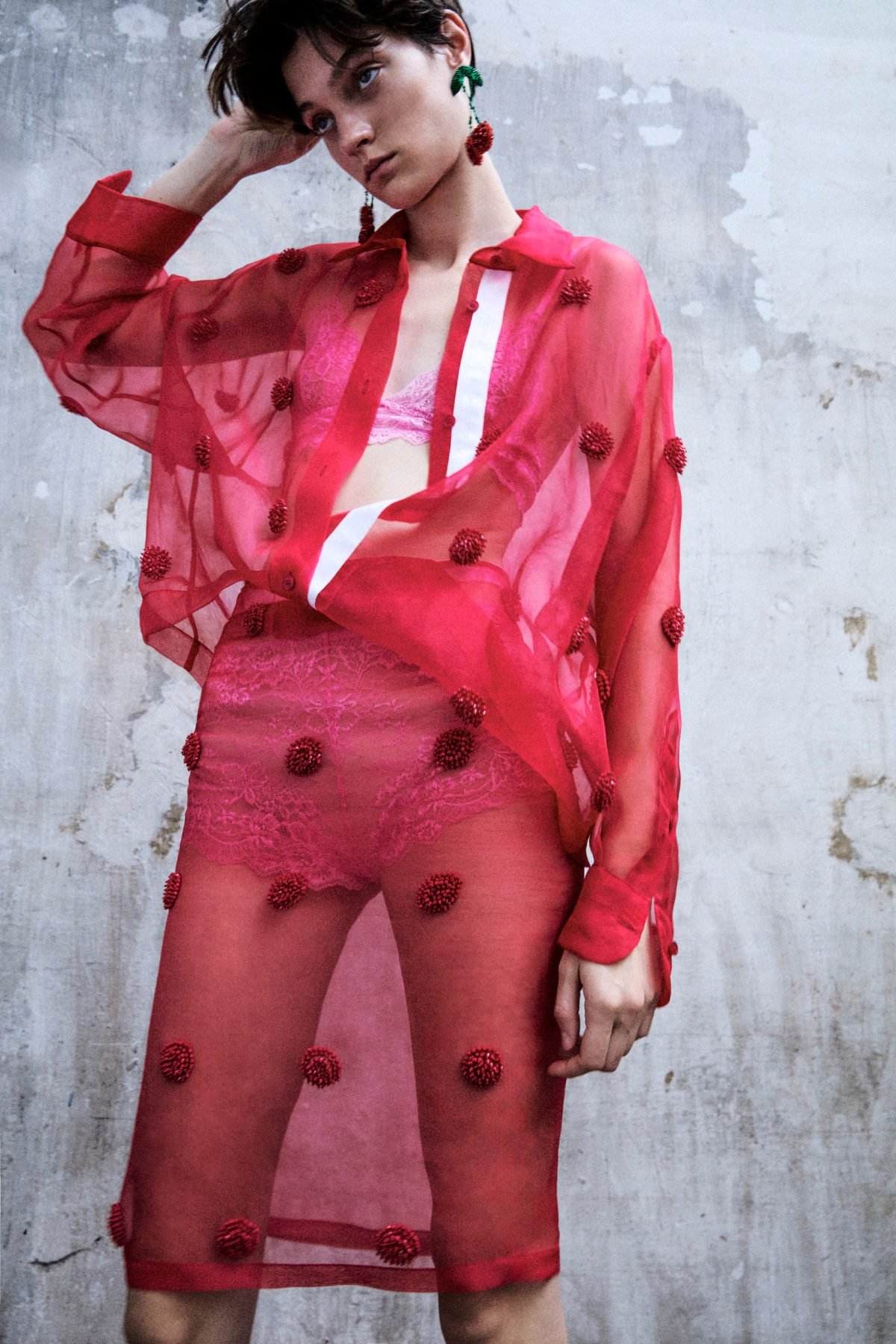 Il guardaroba diventa quindi un mix di opposti: chiodi in ecopelle invecchiata si mixano a bustini ricamati in pizzo chantilly color cioccolato e a longuette nude “bagnate” da paillettes trasparenti e ricoperte di piccole ciliegie ricamate. Abiti dalle linee iper pulite e di matrice 60s si coprono di ricami geometrici, chiave di forza del brand, in toni soft o super saturi. La camicia da uomo, capo irrinunciabile del guardaroba Des_Phemmes e indumento “cult” del guardaroba maschile, si indossa con longuette in paillettes degradè ricamate a mano o con minigonne A-line in duchesse di seta dal ricamo geometrico. L’intimo ricamato in pizzo chantilly nelle nuances limone, fucsia e cioccolato si discosta ancora una volta dalla sua funzione originale di capo da nascondere, divenendo un vero accessorio del look, che ne esalta i colori e le silhouettes. Camicie over e minigonne in tulle color nude, impreziosite da macro rose di nastri e cristalli, lasciano infatti intravedere bralette e culotte dai toni accesi e vibranti. Trasparenze e layering diventano così il leitmotiv della collezione: capi in tessuti leggeri e trasparenti come georgette e organza di seta vengono indossati con lingerie a vista dai colori vividi, a sottolineare la presenza dell’intimo, e senza mai volerlo nascondere.