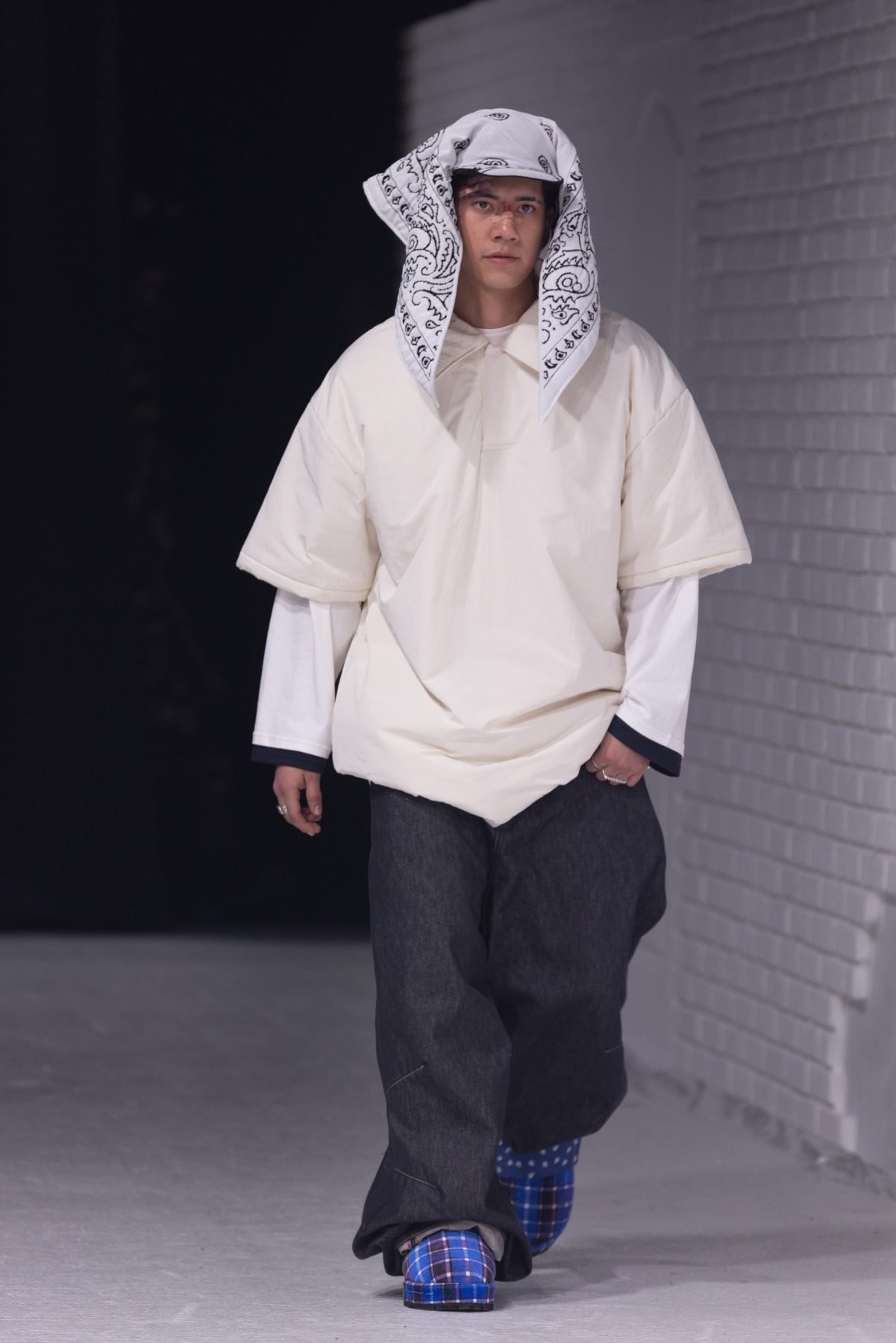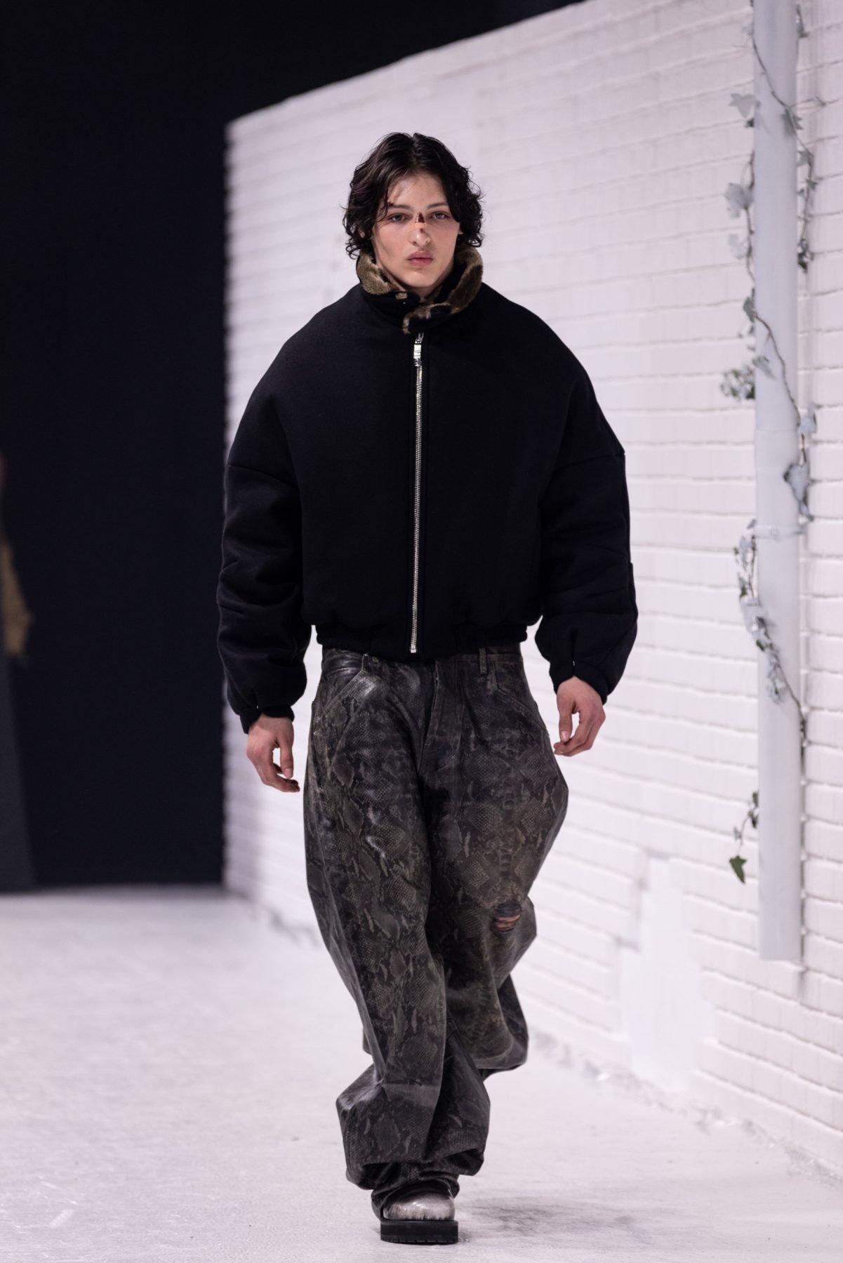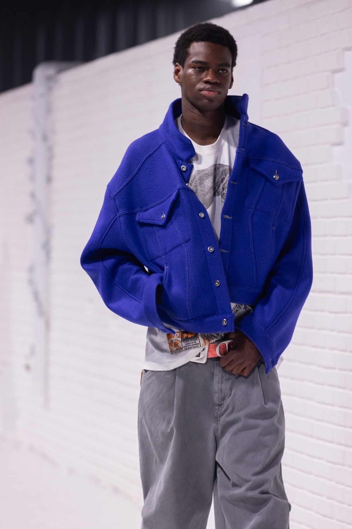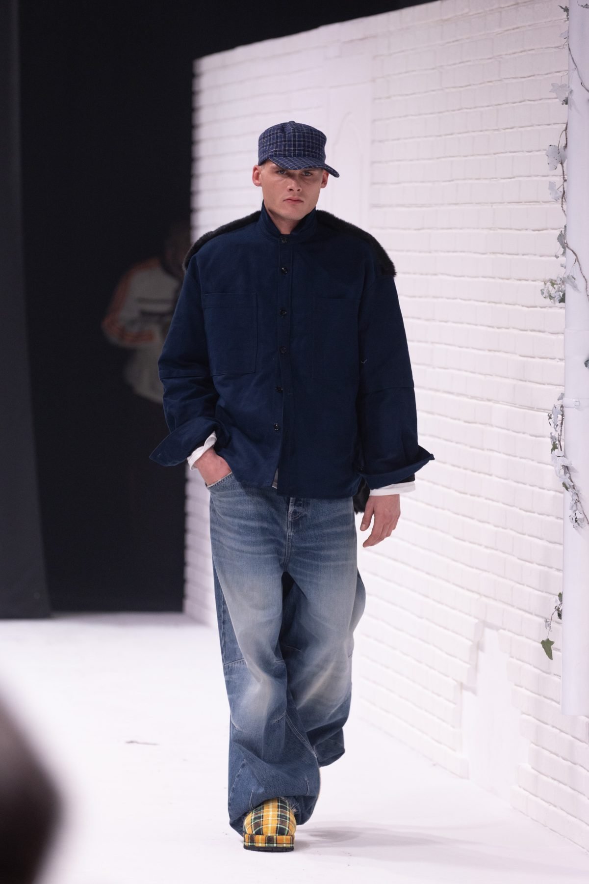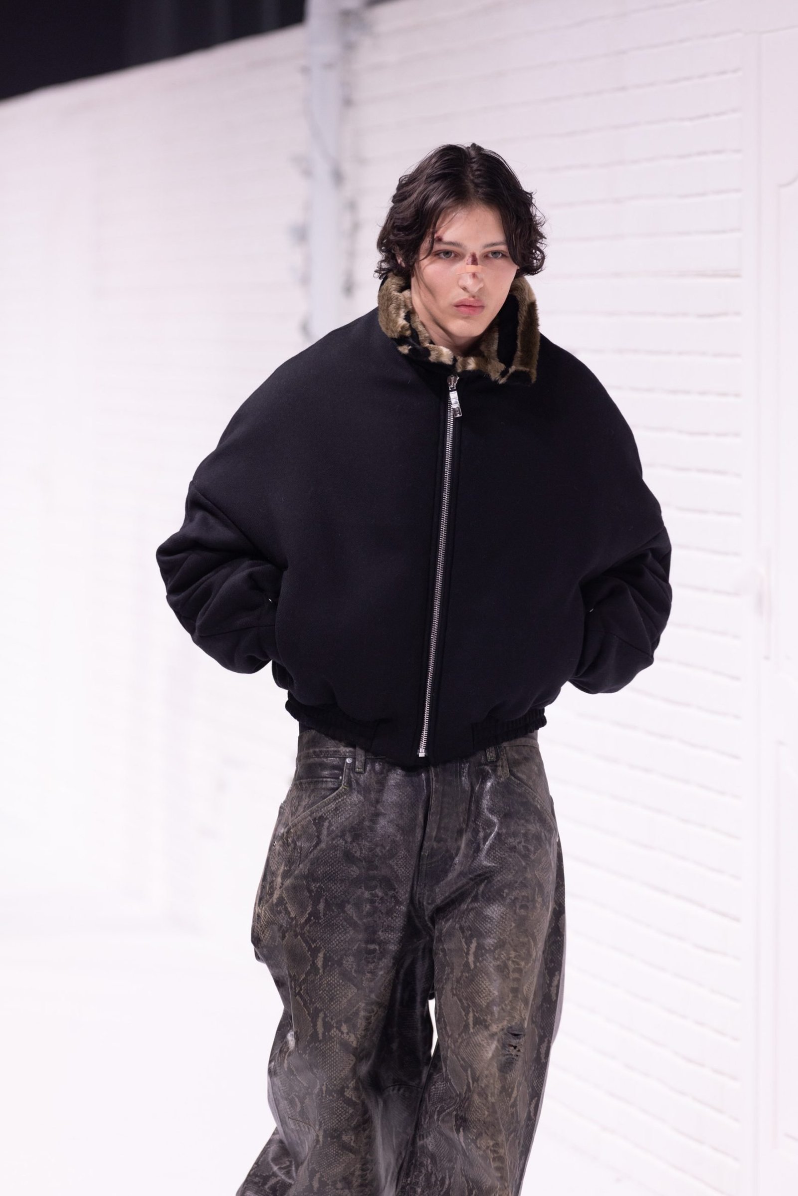 Yet, this collection is not a nostalgic homage but a recontextualization. Outdoor sports references provide a counterpoint to the urban grit. The collection’s exaggerated proportions and layered silhouettes take cues from the bold, practical designs of snowboarding gear, merging technical innovation with streetwear’s raw energy. Blazers with deconstructed lapels, utilitarian overalls in iridescent fabrics, and quilted outerwear blend technicality with a sense of play.